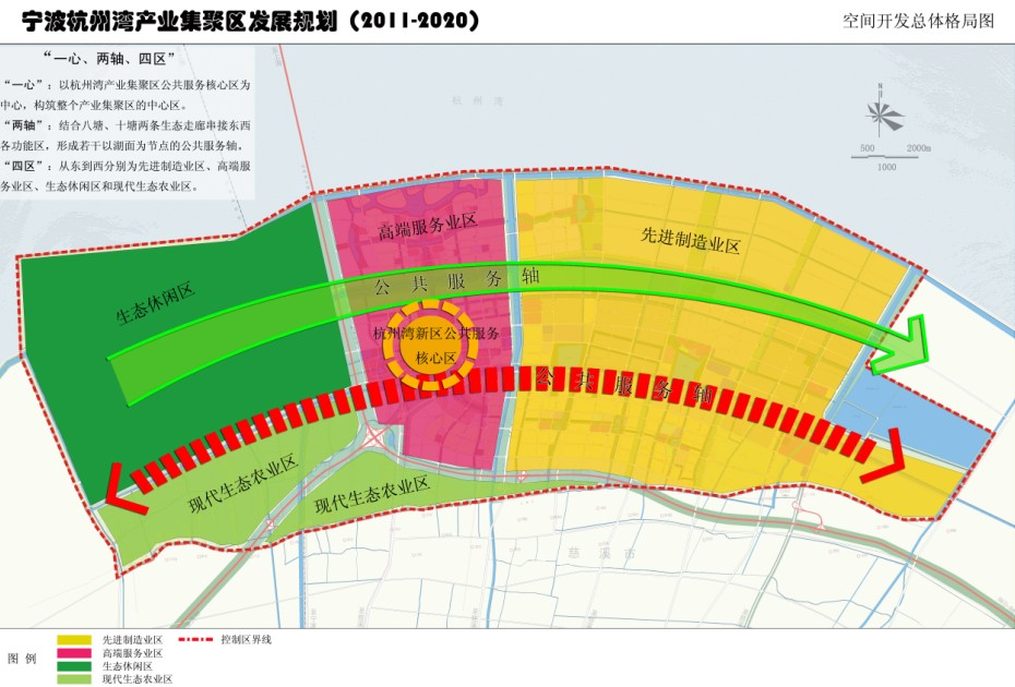 一心 即整个杭州湾产业集聚区的核心区,以杭州湾新区公共服务核心区为中心,构筑整个产业集聚区的中心区。规划面积10平方公里,是产业集聚区的公共服务核心和标志性景观地域,将以功能复合为特点,集企业总部、金融服务、商贸商务、产业服务、品质居住等一体的城市中心区。
